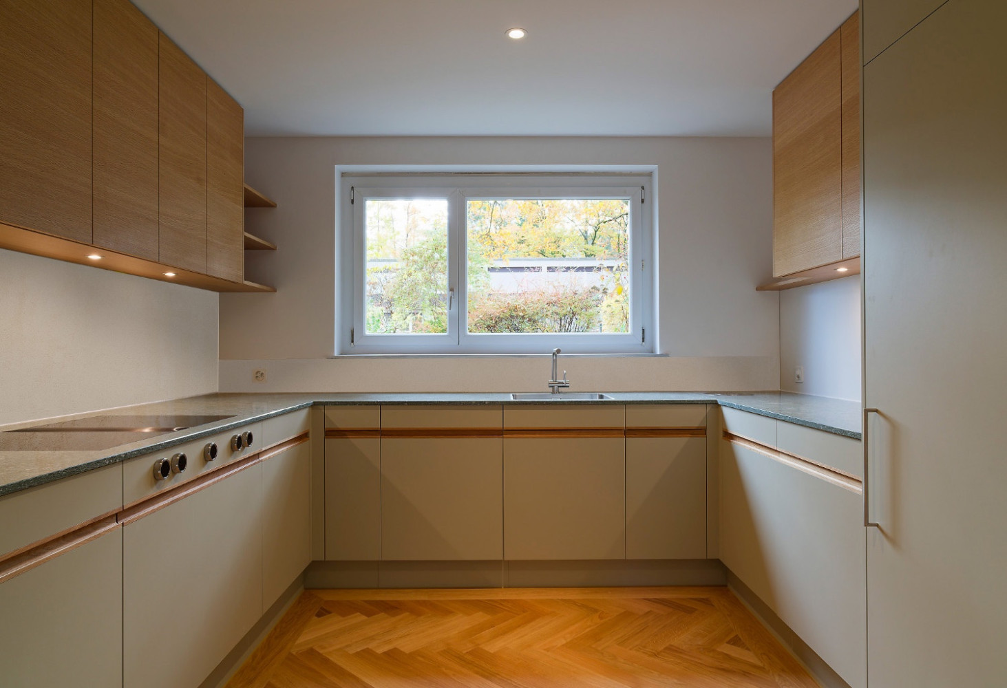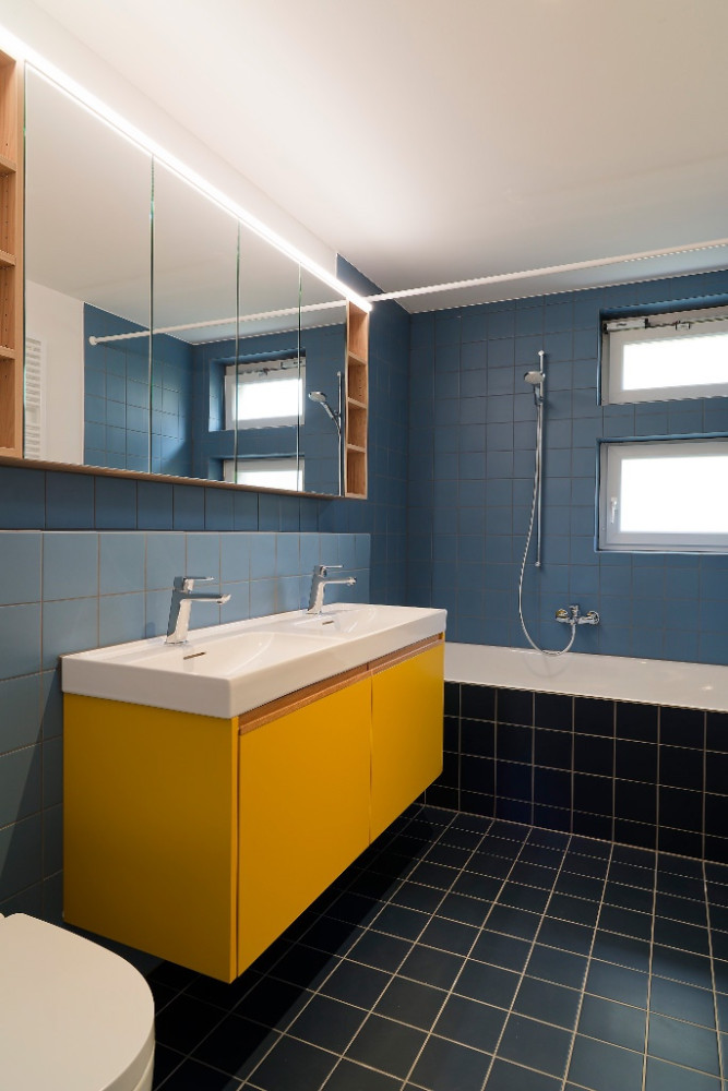 Die Materialisierung und Farbgebung orientiert sich am Bestand und ergibt ein neues, stimmiges Ensemble. Im Erdgeschoss befinden sich die Tagesräume, die Schlafräume im Obergeschoss werden über ein internes Treppenelement erschlossen. Garderobe, Küche und Gäste-WC werden im Zugangsbereich räumlich zusammengefasst.