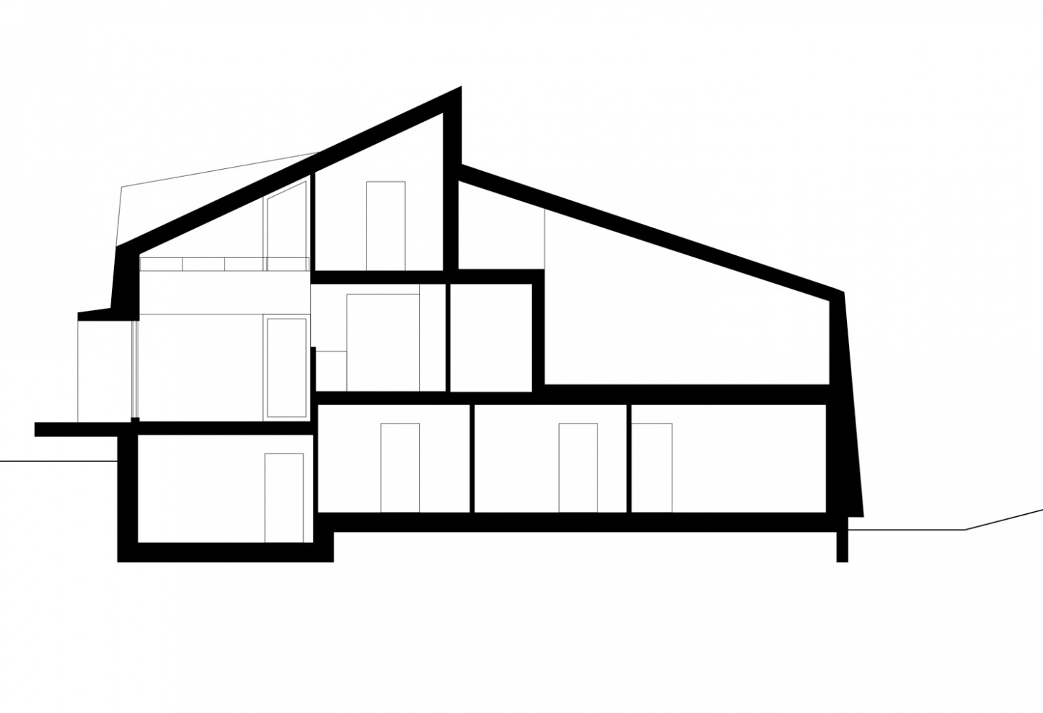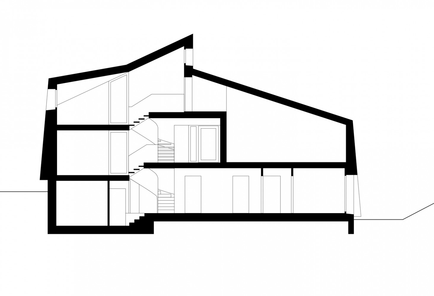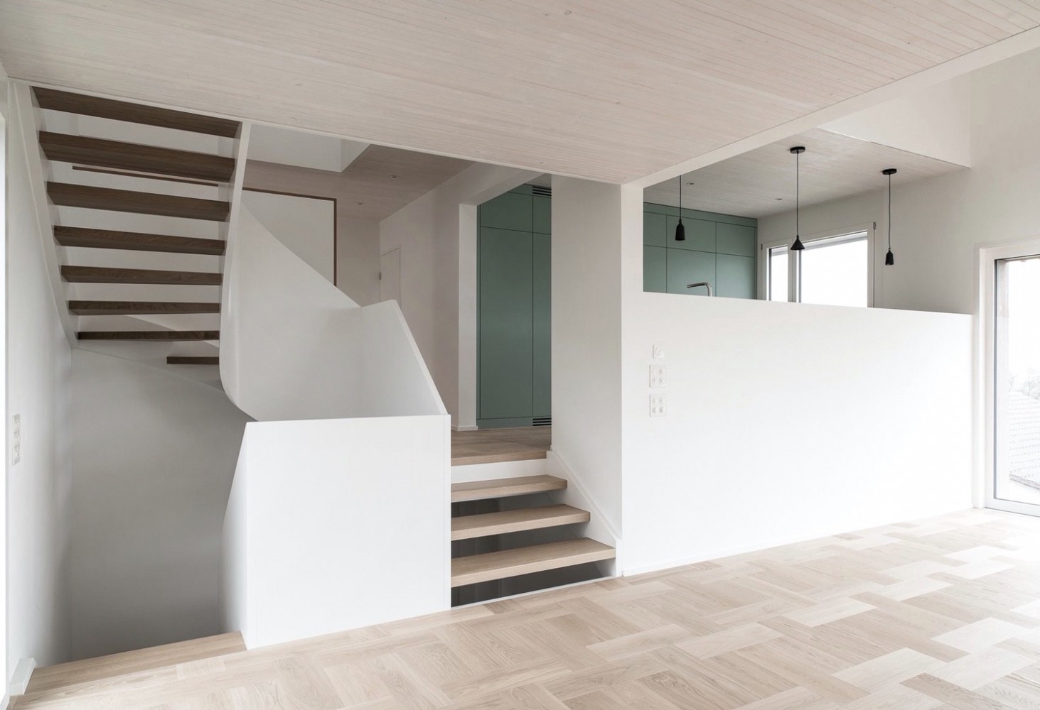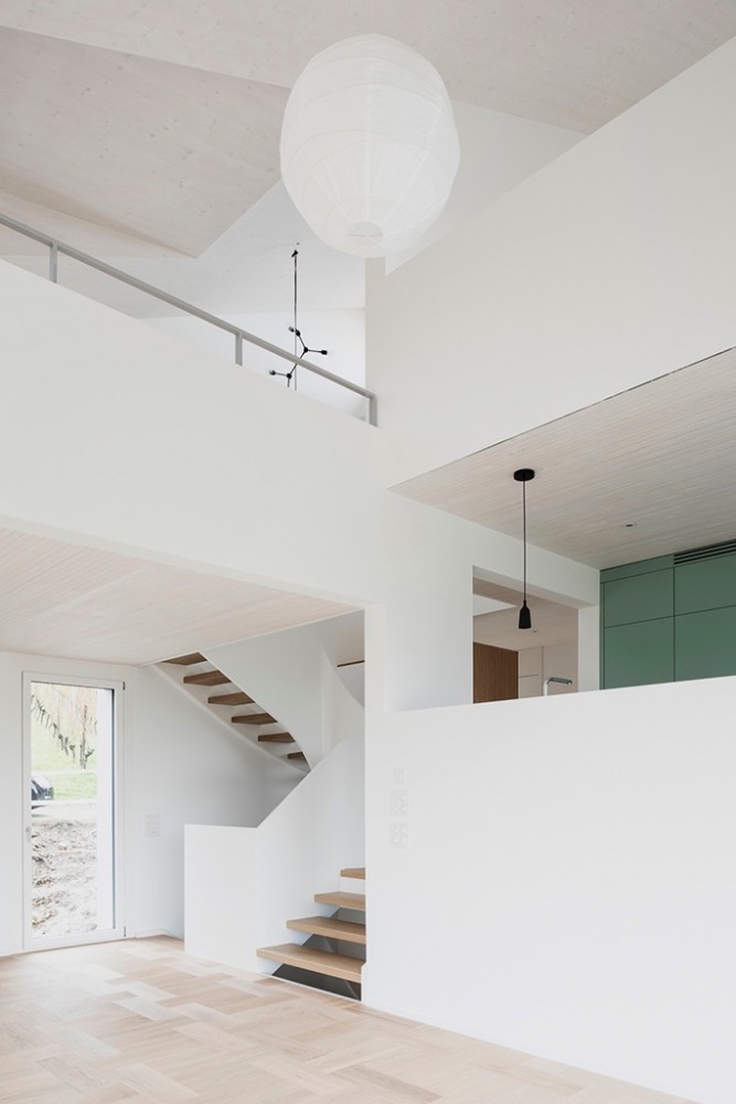 Innenräumlich sind die Wohnräume (Tagesräume) zu den individuellen Räumen wie Schlafzimmer halbgeschossig versetzt und erlauben auf den verschiedenen Ebenen gegenseitige Durchblicke.