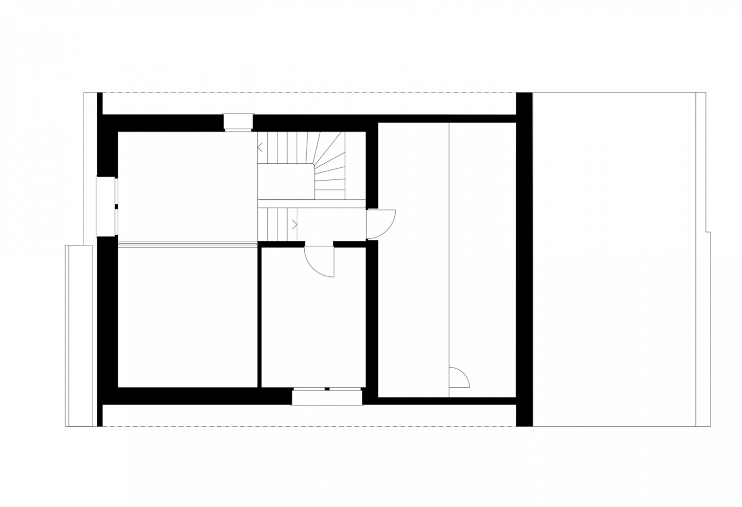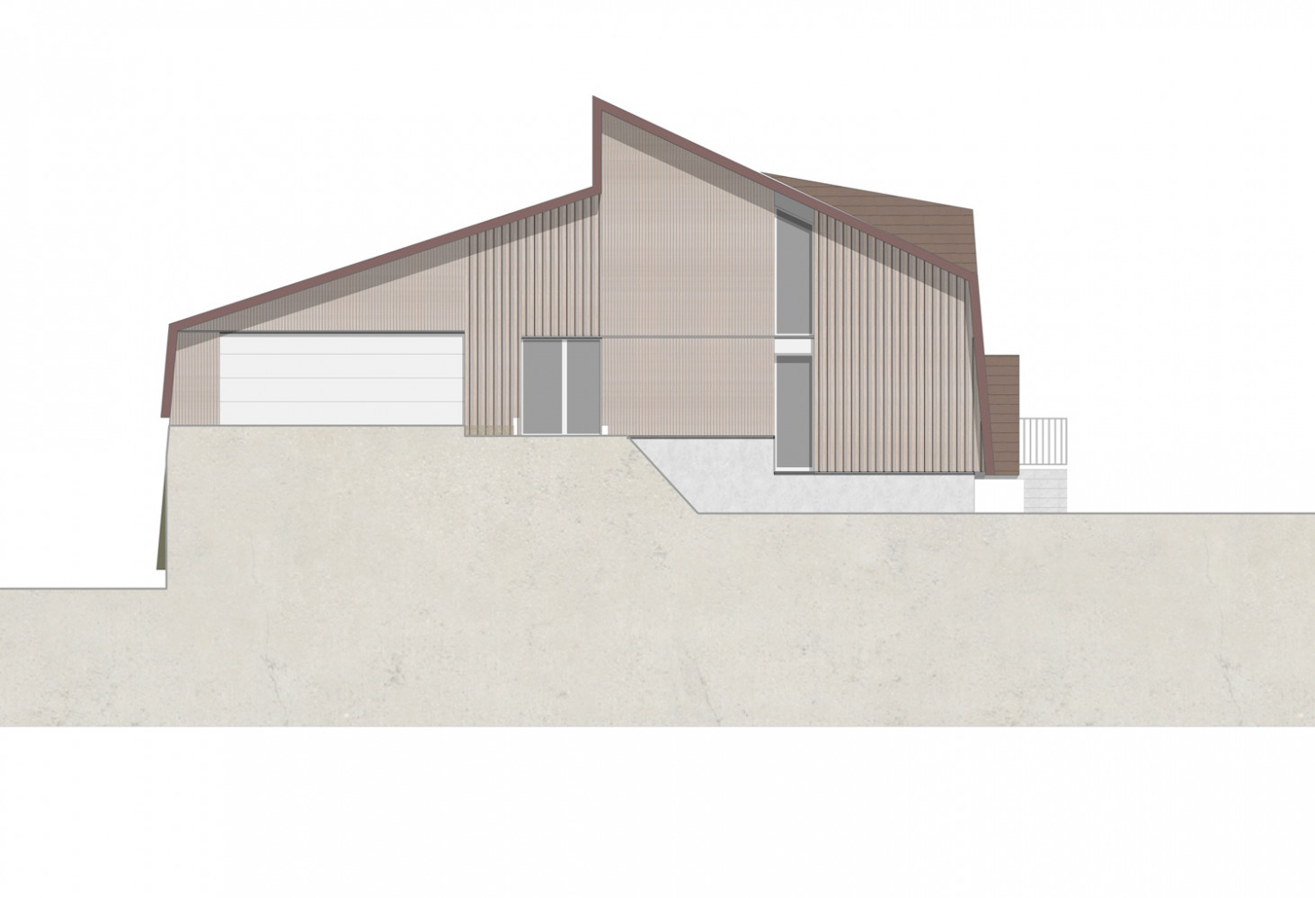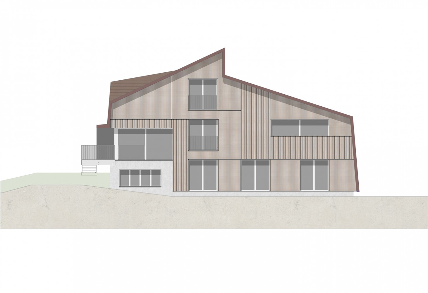 Die Dachform interpretiert die Typologie der umliegenden Häuser auf unkonventionelle Art und Weise - das Dach wird als schützende Haut verstanden, welche auf den Traufseiten zur Fassade wird.